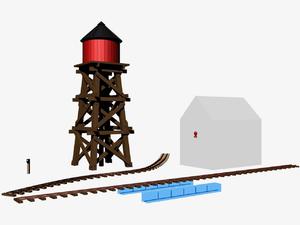 The display starts as the train pulls into Catastrophe Creek. The alarm sounds, a cascade of water falls from the water tower and jets of air shoot up from water troughs beside the track.