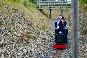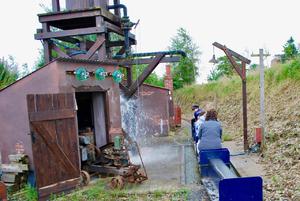 The display starts as the train pulls into Catastrophe Creek. The alarm sounds, a cascade of water falls from the water tower and jets of air shoot up from water troughs beside the track.